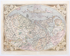 Niederlande und Belgien. "Descriptio Germaniae Inferioris". Karte im Oval, in den Ecken ornament. Verzierungen. Kol. Kupferstich (aus A. Ortelius, span. Ausgabe, 1602). Mit ausgem., von Putti gehaltener Schriftkartusche. 38:51 cm.