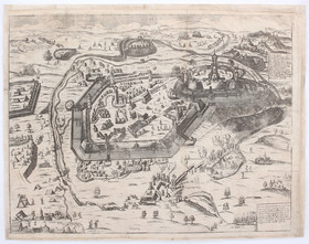 Gotha. "In dem Jahr 1567, den 25. tag January wart die gewaltige vestung das Schloss Grimmenstein, und die Statt Gotha belegert von dem heijligen Rö: Reich". Belagerungsansicht aus der halben Vogelschau mit Umgebung. Kupferstich (aus Sagittarius/Tenzel, Hist. Gothana), um 1700; gest. von J. G. Göbel. Mit 2 kl. Schriftkästen mit Legende und Erl. 41:52 cm.
