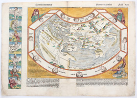 "Secunda etas mundi" (Kopftitel). Karte der Alten Welt, umgeben von Bordüre mit den antiken Windgöttern; in 3 Ecken Abb. von Sem, Cham und Japhet. Links neben der Karte Leiste mit 7 kl. Holzschnittfiguren, rückseitig weitere 14 ähnliche Darstellungen. Kol. Holzschnitt (aus der Schedel'schen Weltchronik, latein. Ausg., 1493). 31:44 cm; auf dem vollen Doppelblatt.