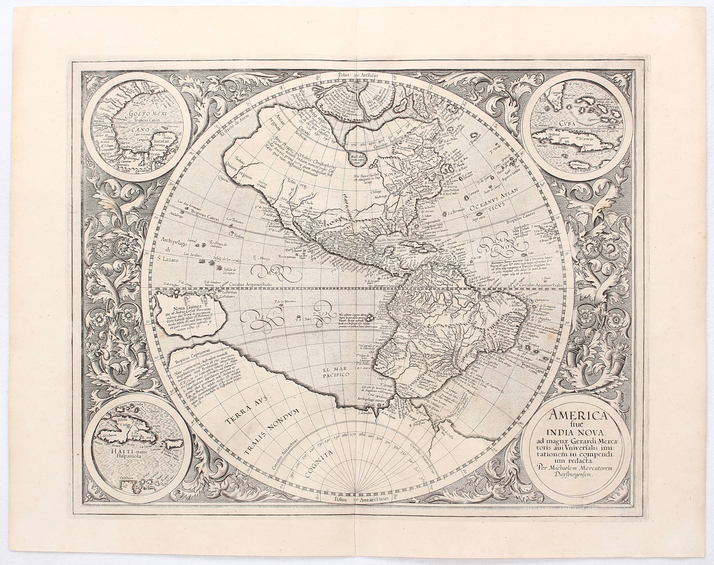 "America sive India Nova". Amerika-Karte im Rund, umgeben von floraler Bordüre, in den Ecken Schriftkartusche und kl. Karten von Haiti, Golf von Mexico und Kuba (jeweils im Rund). Kupferstich nach G. von M. Mercator. 36,5:45,5 cm.