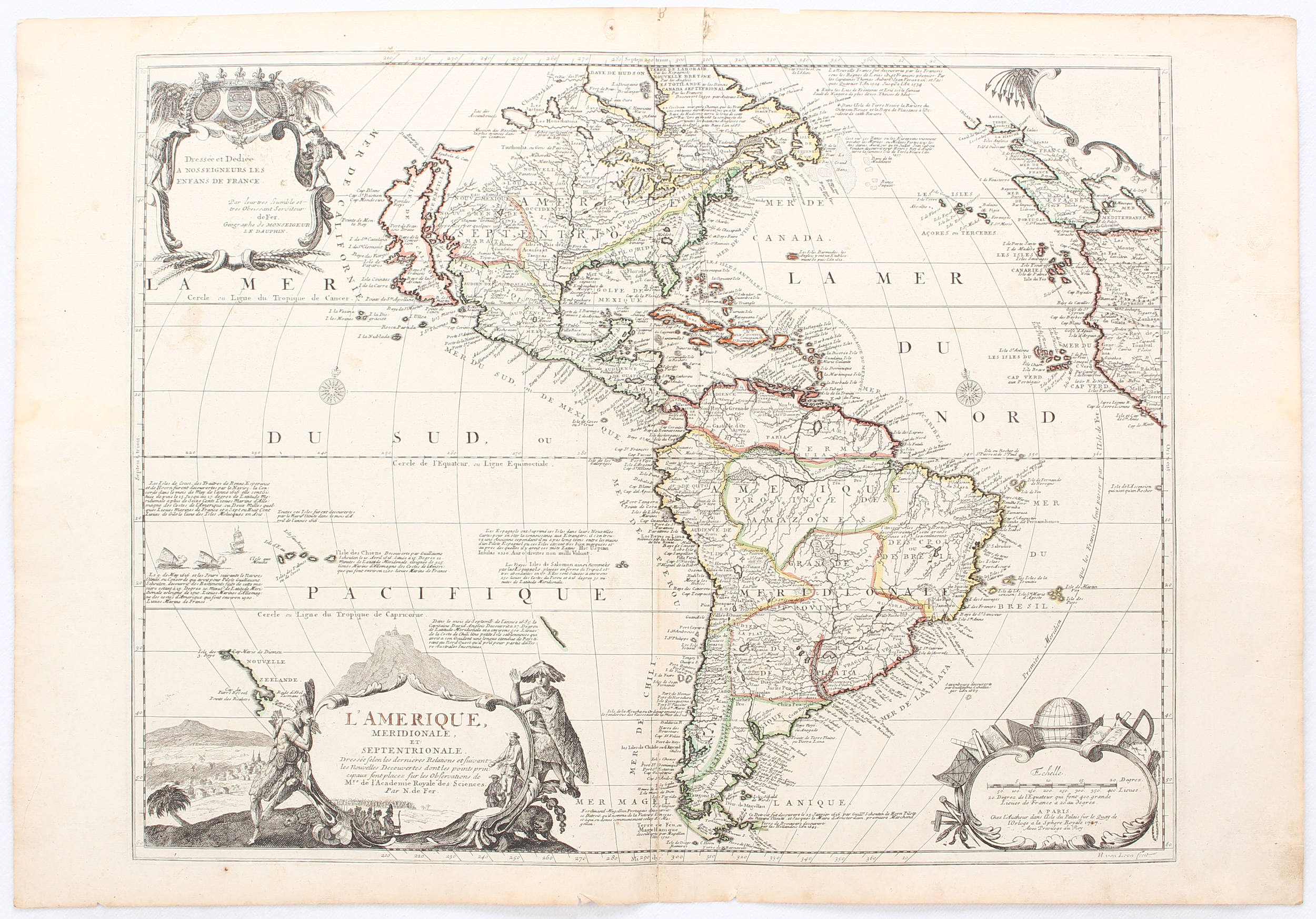 "L'Amerique, meriodionale, et septentrionale". Grenzkol. Kupferstich-Karte von N. de Fer, Paris, 1717; gest. von H. van Loon. In den Ecken ornament. Kartuschen (eine nicht ausgefüllt) mit Staffage, darunter Wappen, Globus, Indianer und Landschaft. 46:59,5 cm.
