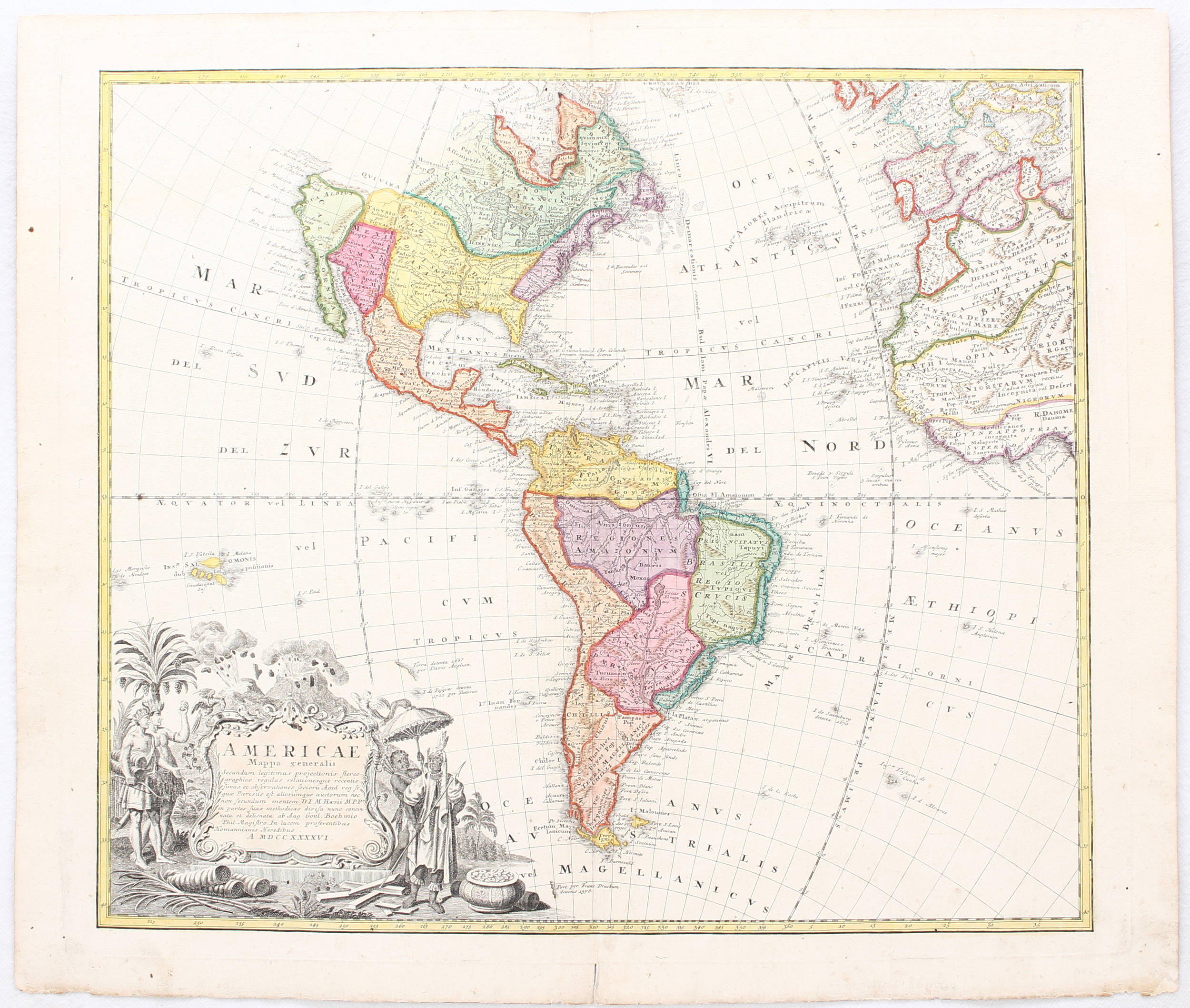 "Americae Mappa generalis". Altkol. Kupferstich-Karte nach J. M. Haas von A. G. Boehme bei Homann Erben, 1746. Mit fig. Kartusche. 46,5:53,5 cm.