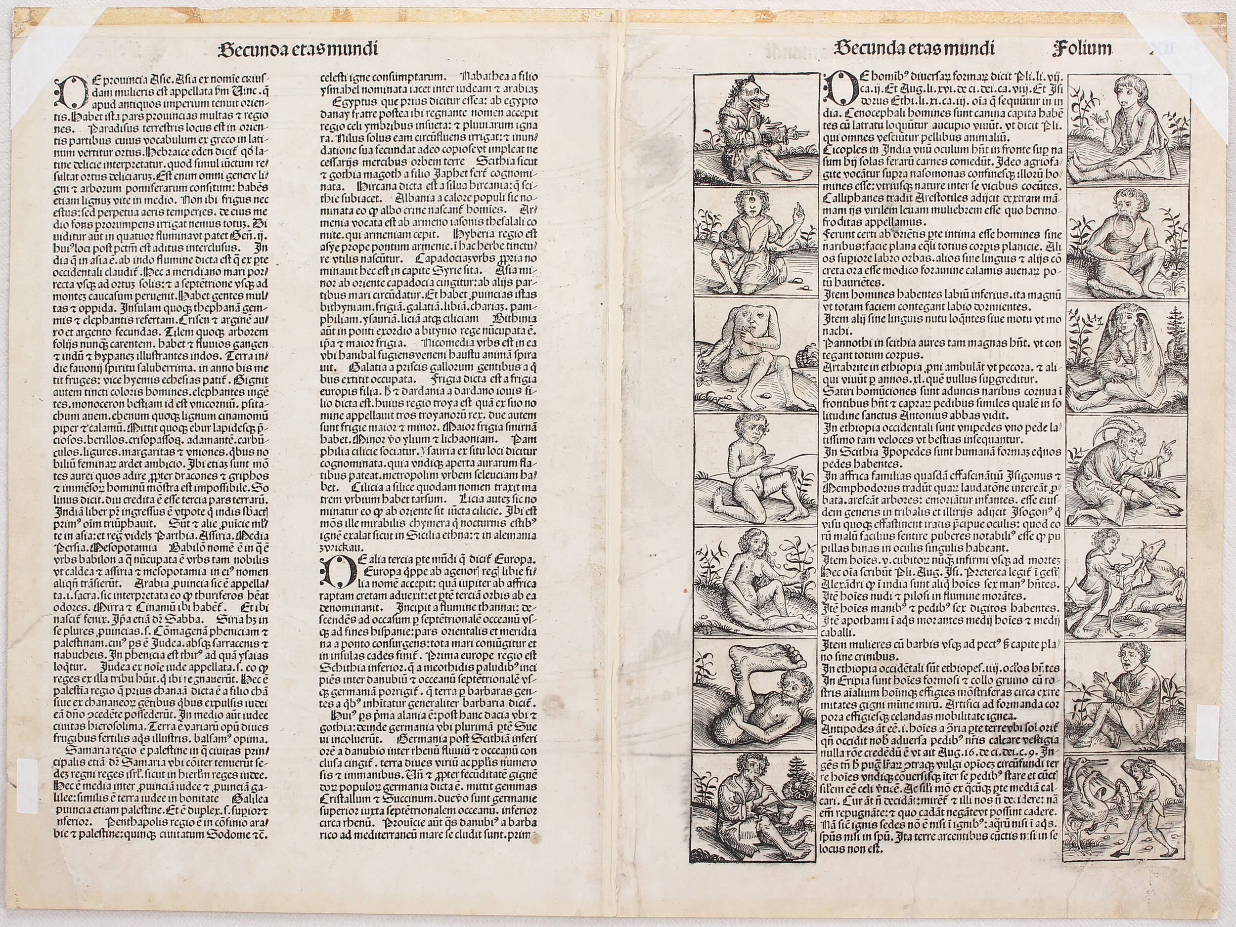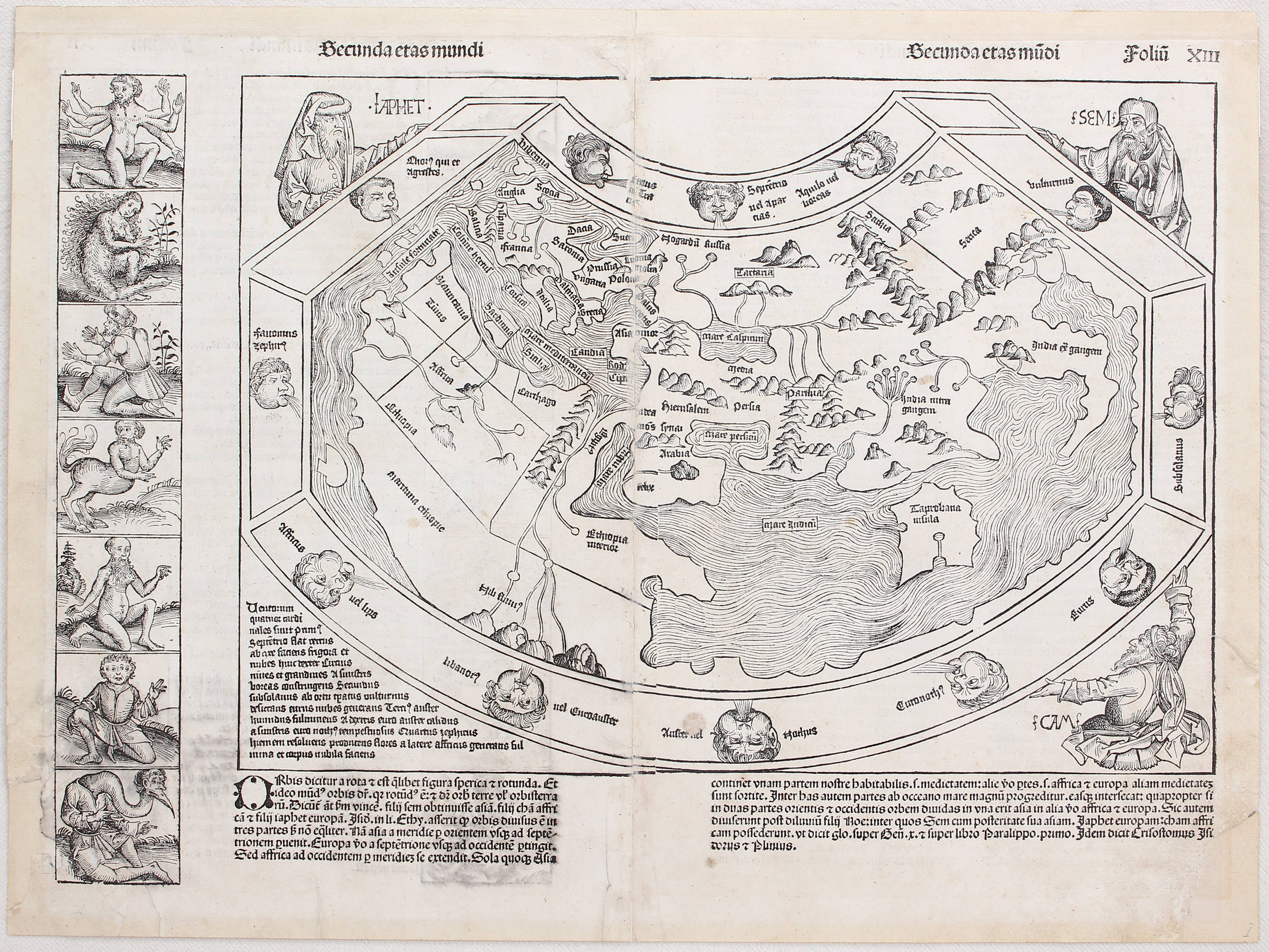 Woodcut map of the Old World from a Latin edition of Hartmann Schedel's famous Chronicle. "What gives the map its present-day interest and attraction are the panels representing the outlandish creatures" (Sh.). - Uncol. Light browning and some spotting in places, stronger to margins and with repaired tears and splits, lower corners replaced. Repairs to tears and splits at centerfold, there some tiny stitches caused from former binding; remargined at top and at sides.