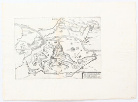 Anonymous French bird's eye view of Fort Fuentes; with further mss. text in ink on verso (see above). - Water color and ink drawing. Some browning, spotting and somewhat dusty; with some folds. Mounted on linen, and on verso also remnants of a French world map (copper engr.) pasted over.