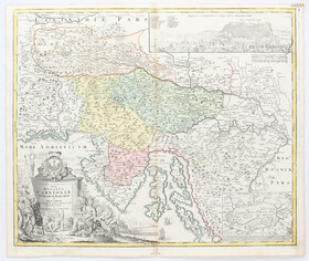 Kroatien und Slowenien. "Tabula Ducatus Carnioliae Vindorum Marchiae et Histriae"; altkol. Nach L. B. Valvasor von J. B. Homann, um 1720. Mit gr. fig. und herald. Kartusche, rechts oben Ansicht von Laibach (Ljubljana; 8:29 cm) und unten Nebenkarte (Zirknitzer See; 10:14,5 cm). 48:57 cm.
