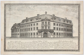 Mainz. "Andreas Wilhelm Pahl. Gasthalter zum Mainzer hof hat dieses Haus zu Mainz auf dem Carmeliter Platz ganz neu erbaut" (auch Englisch u. Französ.). Kupferstich "gezeichnet und gebauet von F. I. Maijr 1786"; gest. von Cöntgen, ebda. Mit der dreisprachigen Beschreibung unten und eingefasst von ornament. Bordüre. 25:40 cm. Etwas fleckig. - Sehr selten.